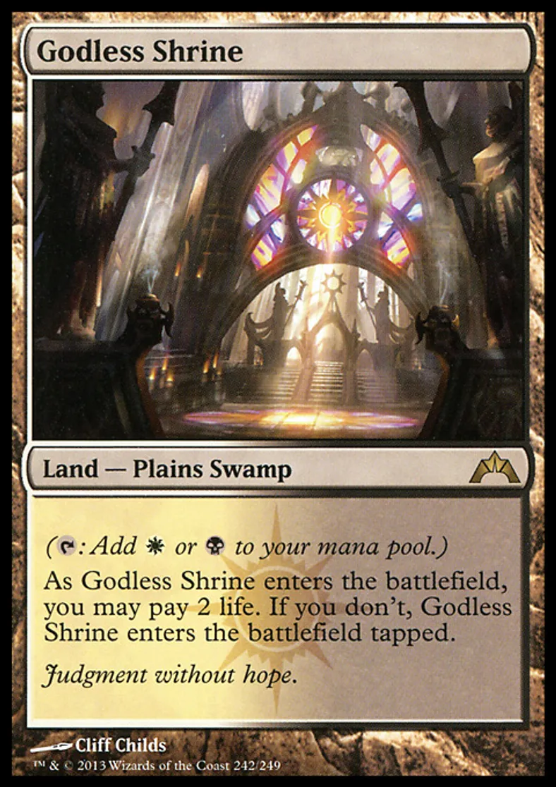 | Oracle Text | ({{t}}: Add {{w}} or {{b}} to your mana pool.) As Godless Shrine enters the battlefield, you may pay 2 life. If you don't, Godless Shrine enters the battlefield tapped. | ||