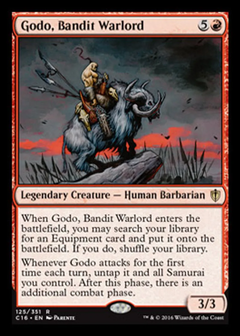 | Oracle Text | When Godo, Bandit Warlord enters the battlefield, you may search your library for an Equipment card and put it onto the battlefield. If you do, shuffle your library. Whenever Godo attacks for the first time each turn, untap it and all Samurai you control. After this phase, there is an additional combat phase. | ||