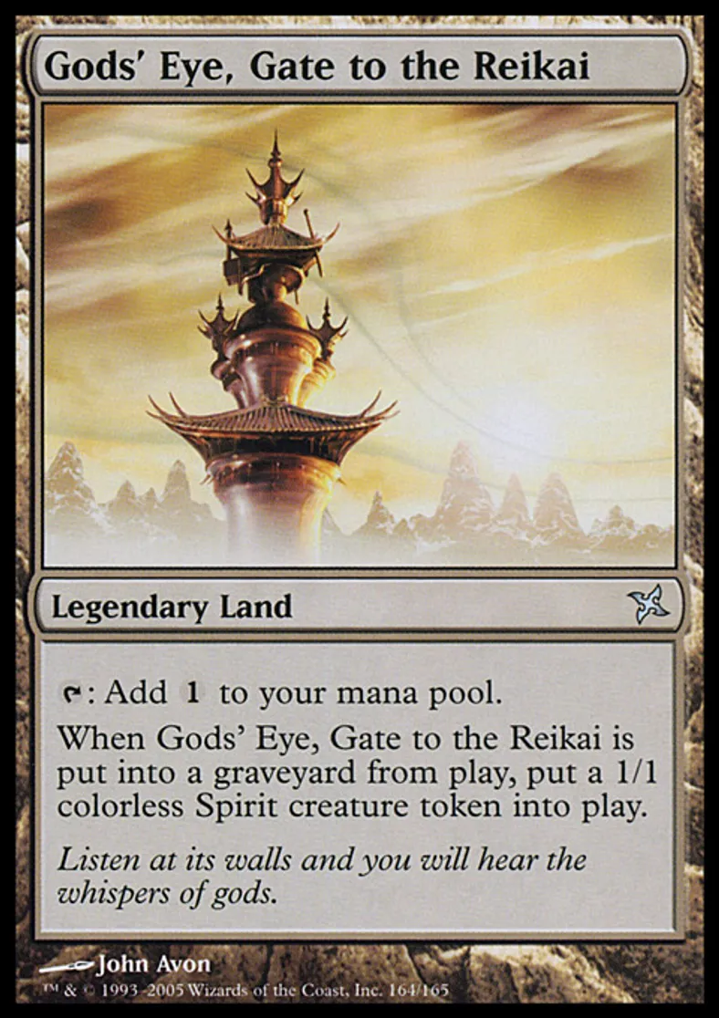 | Oracle Text | {{t}}: Add {{1}} to your mana pool. When Gods' Eye, Gate to the Reikai is put into a graveyard from the battlefield, put a 1/1 colorless Spirit creature token onto the battlefield. | ||