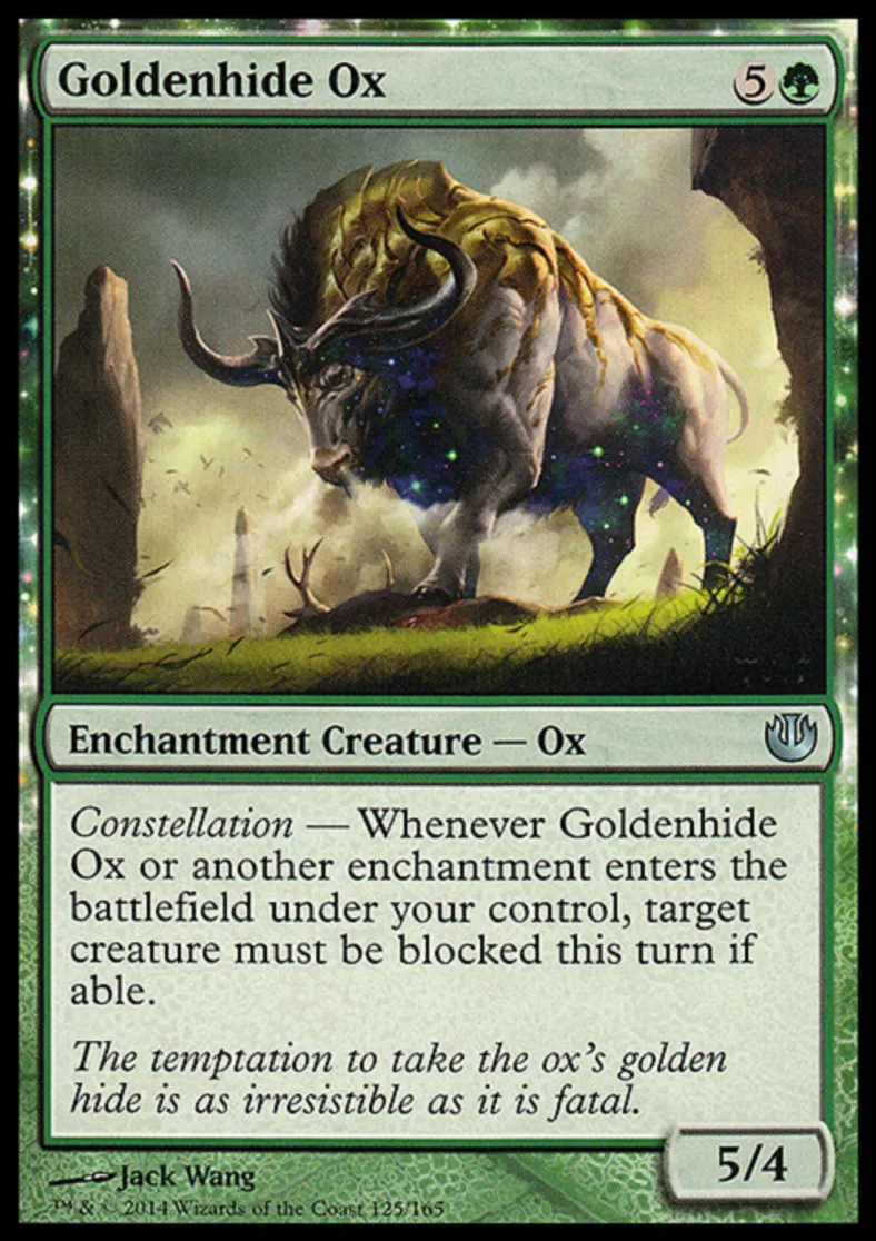 | Oracle Text | Constellation — Whenever Goldenhide Ox or another enchantment enters the battlefield under your control, target creature must be blocked this turn if able. | ||