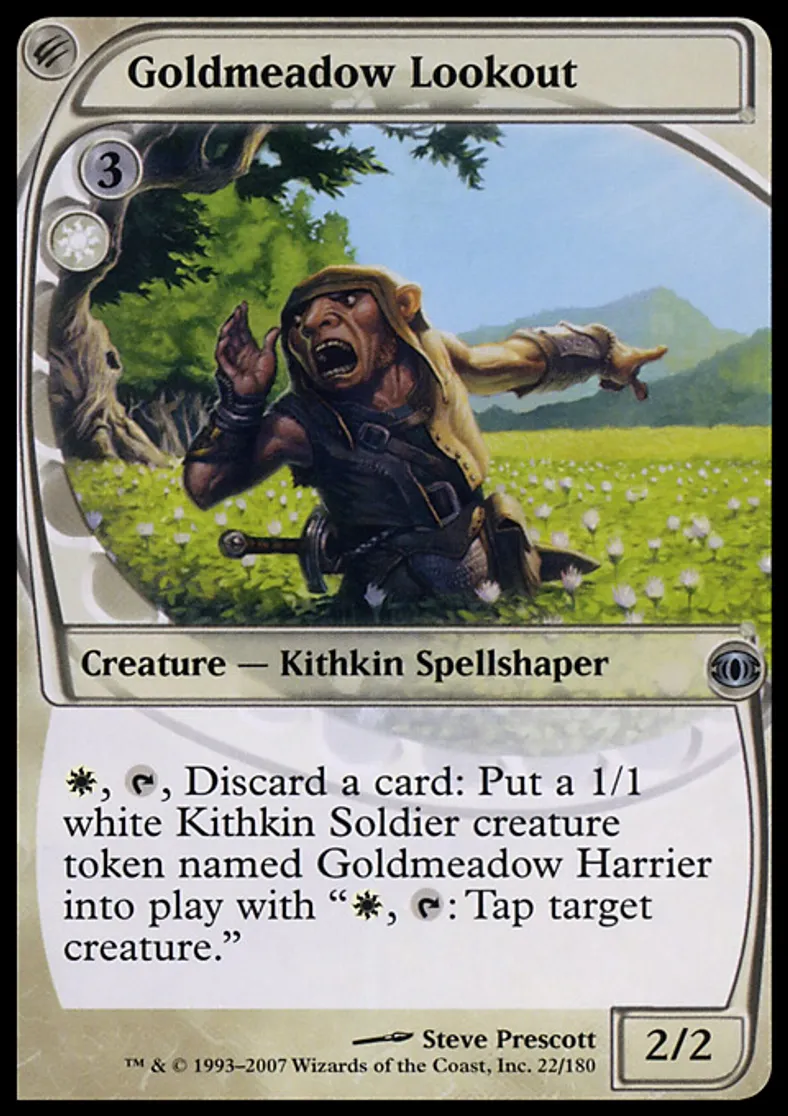 | Oracle Text | {{w}}, {{t}}, Discard a card: Put a 1/1 white Kithkin Soldier creature token named Goldmeadow Harrier onto the battlefield. It has "{{w}}, {{t}}: Tap target creature." | ||