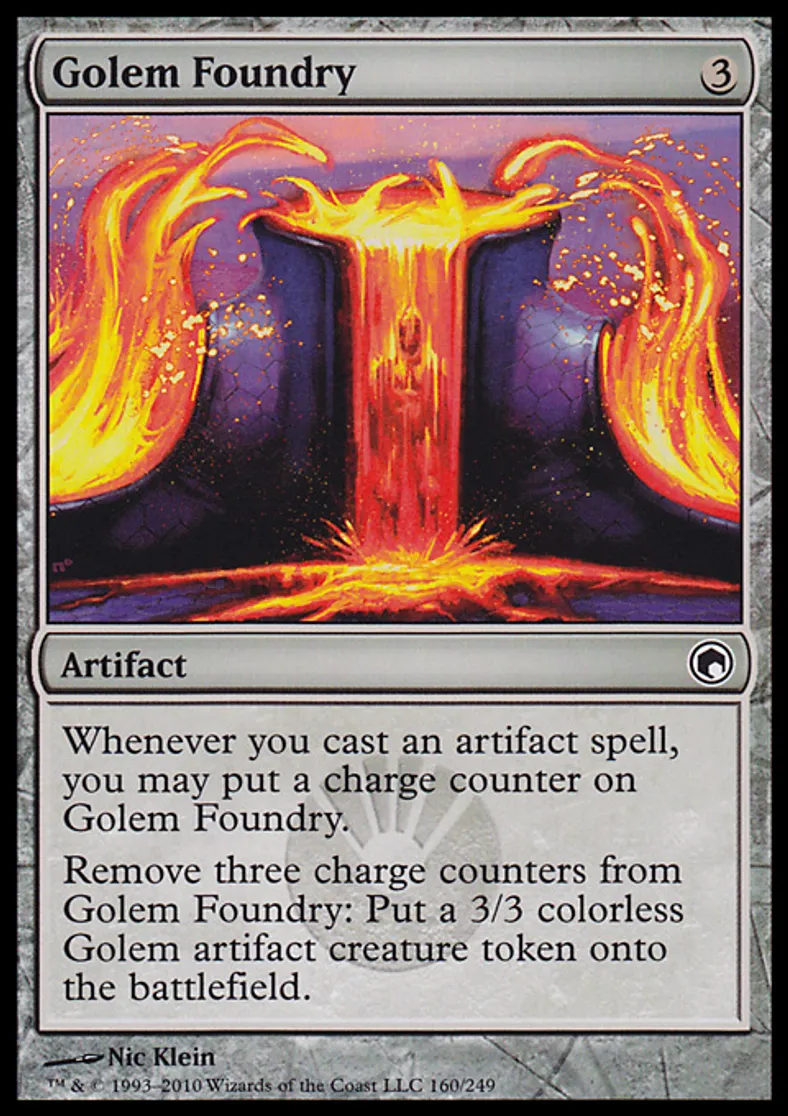 | Oracle Text | Whenever you cast an artifact spell, you may put a charge counter on Golem Foundry. Remove three charge counters from Golem Foundry: Put a 3/3 colorless Golem artifact creature token onto the battlefield. | ||