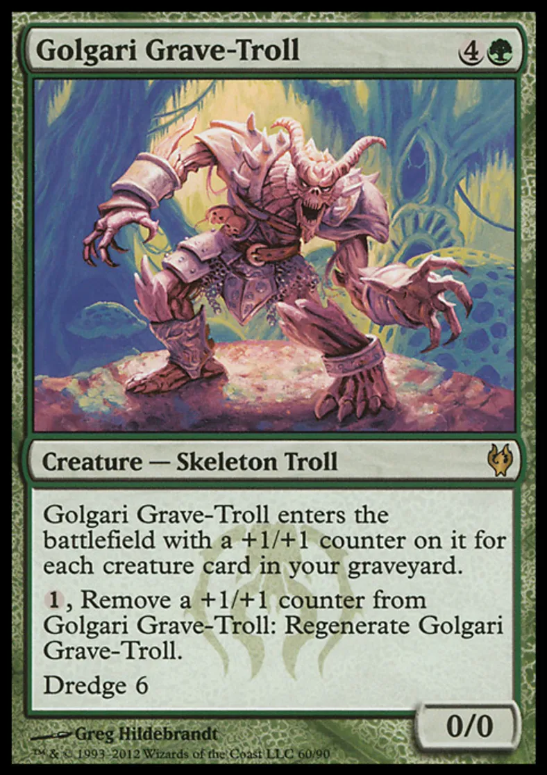 | Oracle Text | Golgari Grave-Troll enters the battlefield with a +1/+1 counter on it for each creature card in your graveyard. {{1}}, Remove a +1/+1 counter from Golgari Grave-Troll: Regenerate Golgari Grave-Troll. Dredge 6 (If you would draw a card, instead you may put exactly six cards from the top of your library into your graveyard. If you do, return this card from your graveyard to your hand. Otherwise, draw a card.) | ||