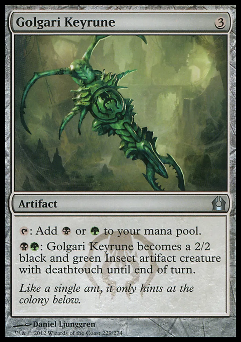 | Oracle Text | {{t}}: Add {{b}} or {{g}} to your mana pool. {{b}}{{g}}: Golgari Keyrune becomes a 2/2 black and green Insect artifact creature with deathtouch until end of turn. | ||