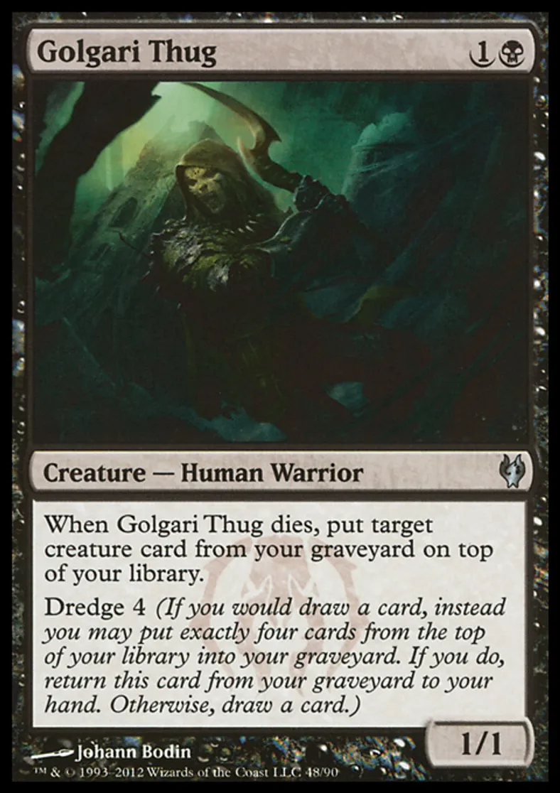 | Oracle Text | When Golgari Thug dies, put target creature card from your graveyard on top of your library. Dredge 4 (If you would draw a card, instead you may put exactly four cards from the top of your library into your graveyard. If you do, return this card from your graveyard to your hand. Otherwise, draw a card.) | ||