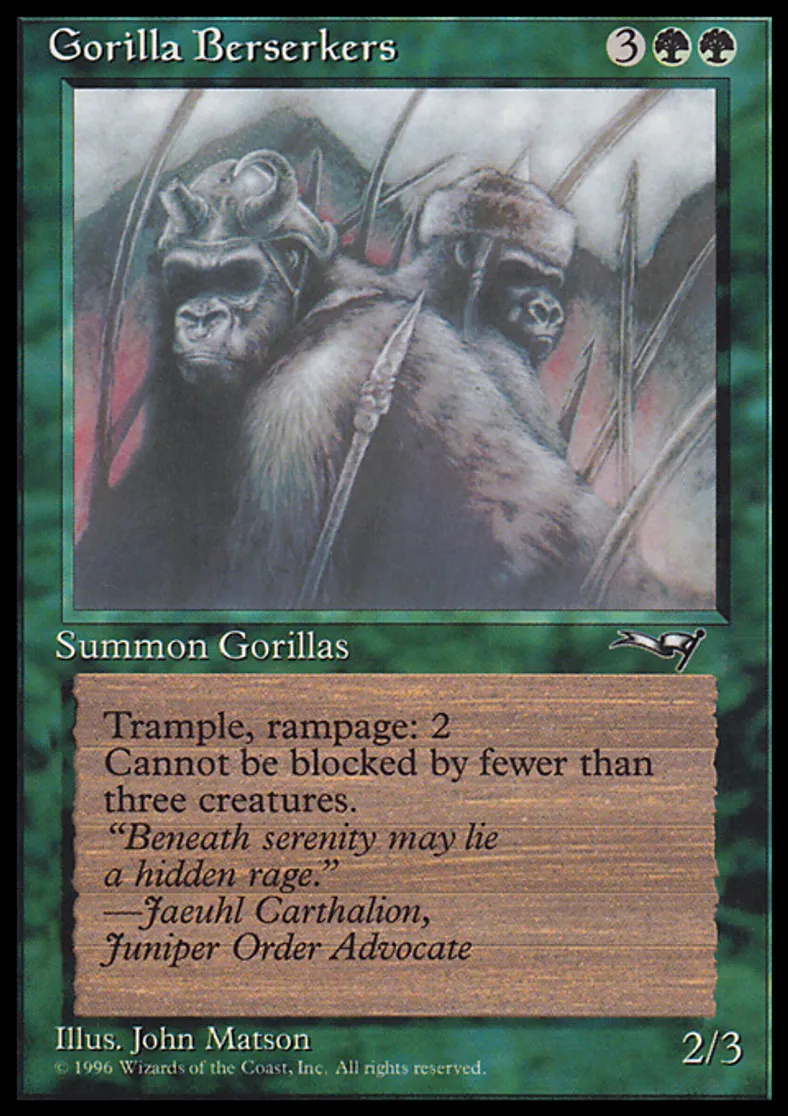 | Oracle Text | Trample; rampage 2 (Whenever this creature becomes blocked, it gets +2/+2 until end of turn for each creature blocking it beyond the first.) Gorilla Berserkers can't be blocked except by three or more creatures. | ||