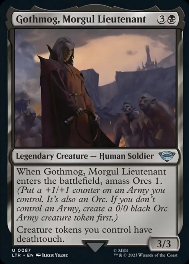 | Oracle Text | When Gothmog, Morgul Lieutenant enters the battlefield, amass Orcs 1. (Put a +1/+1 counter on an Army you control. It's also an Orc. If you don't control an Army, create a 0/0 black Orc Army creature token first.)