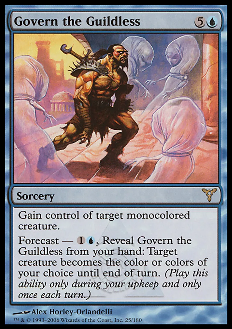| Oracle Text | Gain control of target monocolored creature. Forecast — {{1}}{{u}}, Reveal Govern the Guildless from your hand: Target creature becomes the color or colors of your choice until end of turn. (Activate this ability only during your upkeep and only once each turn.) | ||