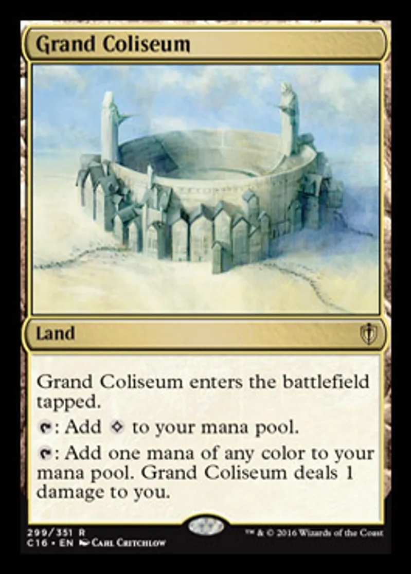 | Oracle Text | Grand Coliseum enters the battlefield tapped. {{t}}: Add {{Colorless}} to your mana pool. {{t}}: Add one mana of any color to your mana pool. Grand Coliseum deals 1 damage to you. | ||