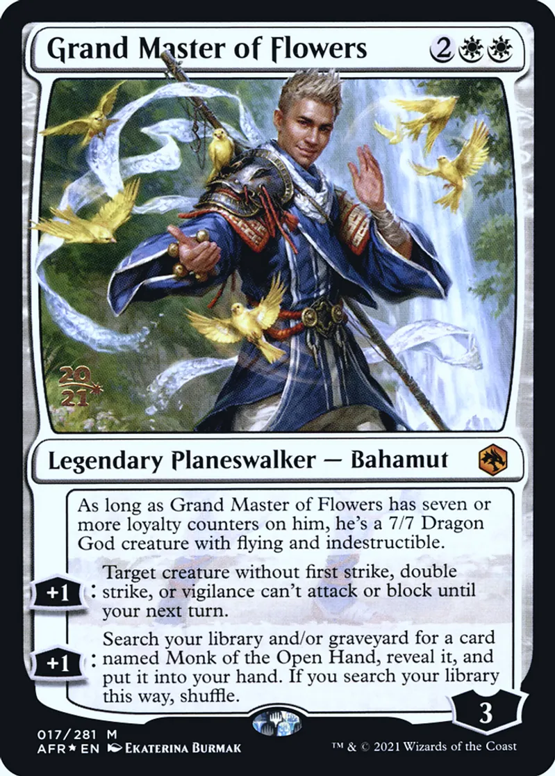 | Oracle Text | As long as Grand Master of Flowers has seven or more loyalty counters on him, he's a 7/7 Dragon God creature with flying and indestructible.