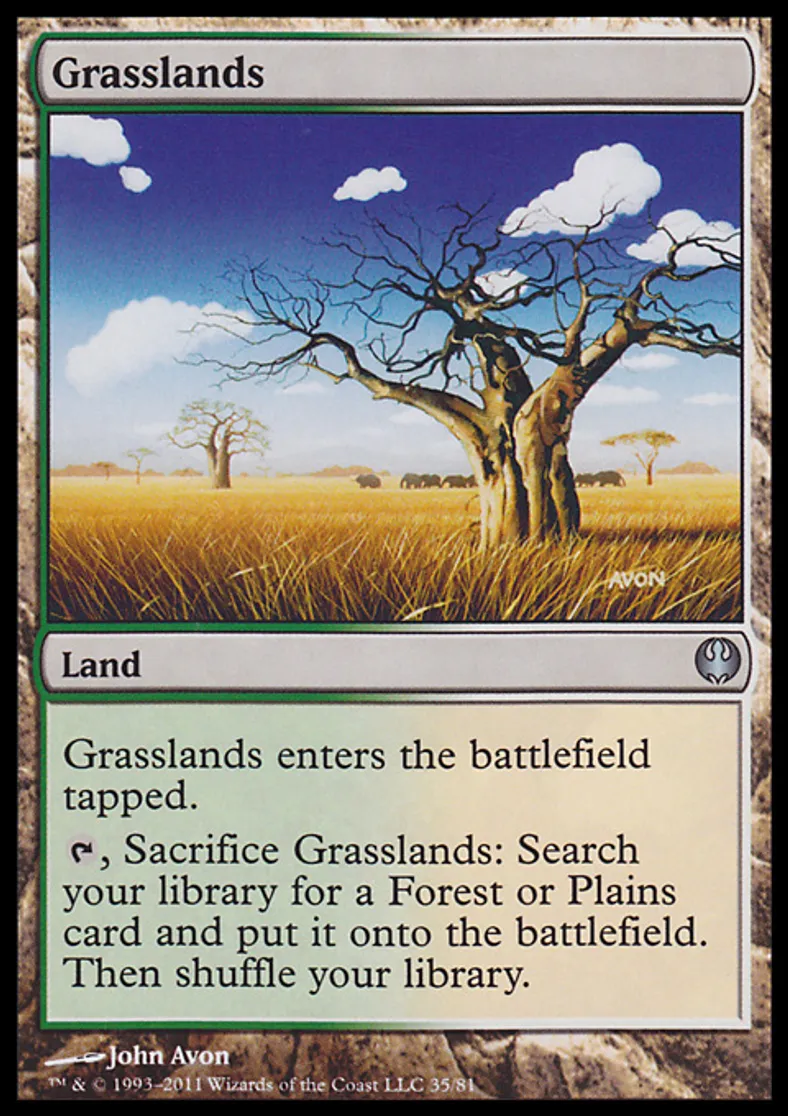 | Oracle Text | Grasslands enters the battlefield tapped. {{t}}, Sacrifice Grasslands: Search your library for a Forest or Plains card and put it onto the battlefield. Then shuffle your library. | ||