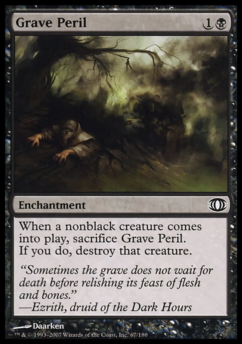 | Oracle Text | When a nonblack creature enters the battlefield, sacrifice Grave Peril. If you do, destroy that creature. | ||