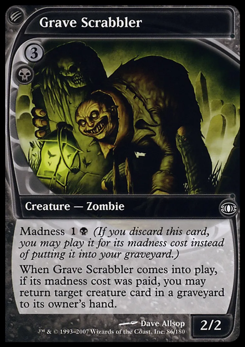 | Oracle Text | Madness {{1}}{{b}} (If you discard this card, you may cast it for its madness cost instead of putting it into your graveyard.) When Grave Scrabbler enters the battlefield, if its madness cost was paid, you may return target creature card from a graveyard to its owner's hand. | ||
