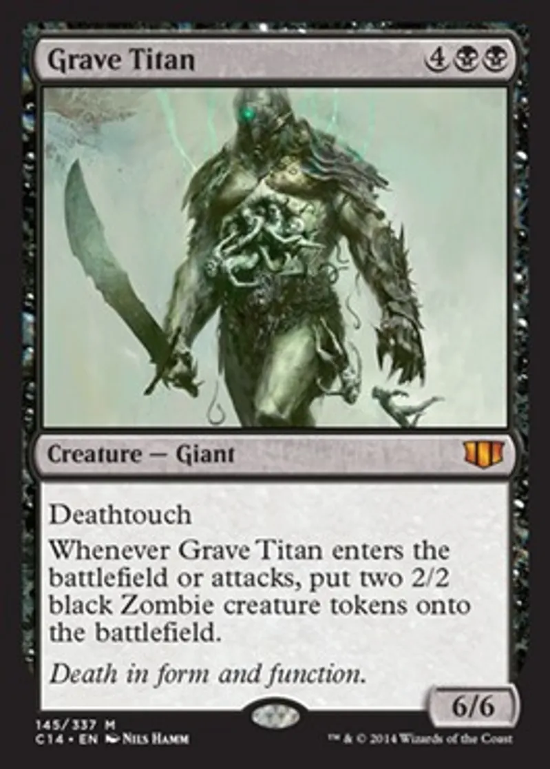 | Oracle Text | Deathtouch Whenever Grave Titan enters the battlefield or attacks, put two 2/2 black Zombie creature tokens onto the battlefield. | ||