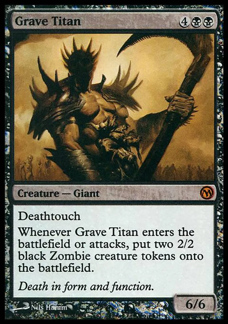Whenever Grave Titan enters the battlefield or attacks, put two 2/2 black Zombie creature tokens onto the battlefield. | ||