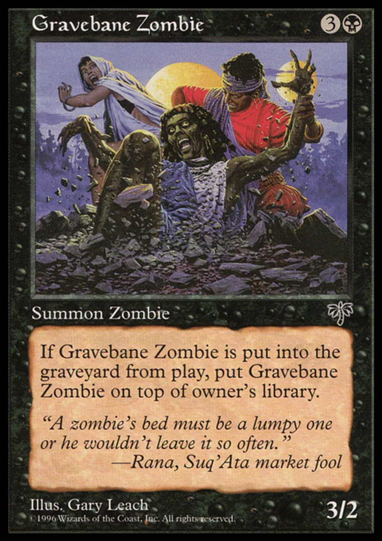 | Oracle Text | If Gravebane Zombie would die, put Gravebane Zombie on top of its owner's library instead. | ||