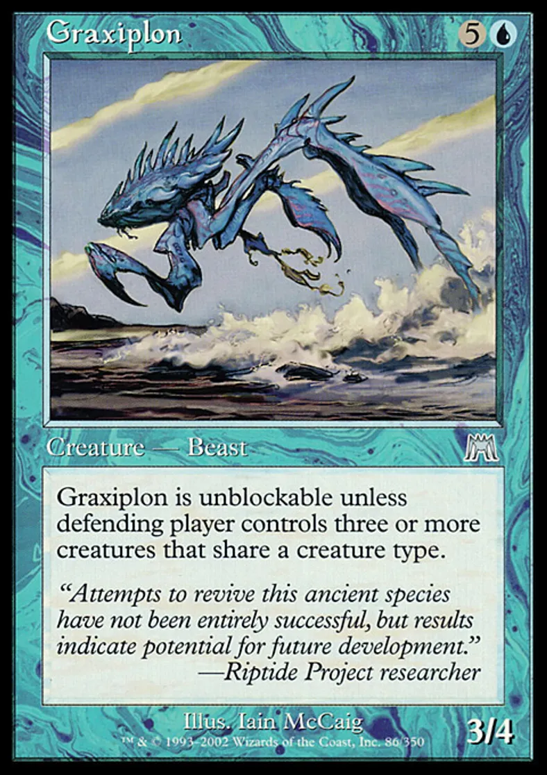 | Oracle Text | Graxiplon is unblockable unless defending player controls three or more creatures that share a creature type. | ||