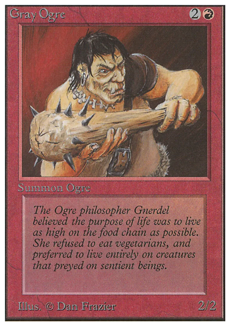 | Flavor Text | The Ogre philosopher Gnerdel believed the purpose of life was to live as high on the food chain as possible. She refused to eat vegetarians, and preferred to live entirely on creatures that preyed on sentient beings. | ||