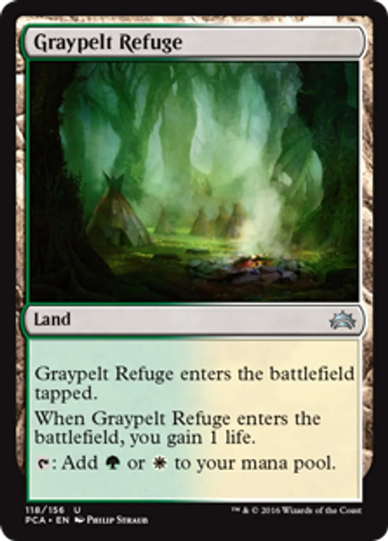 | Oracle Text | Graypelt Refuge enters the battlefield tapped. When Graypelt Refuge enters the battlefield, you gain 1 life. {{t}}: Add {{g}} or {{w}} to your mana pool. | ||