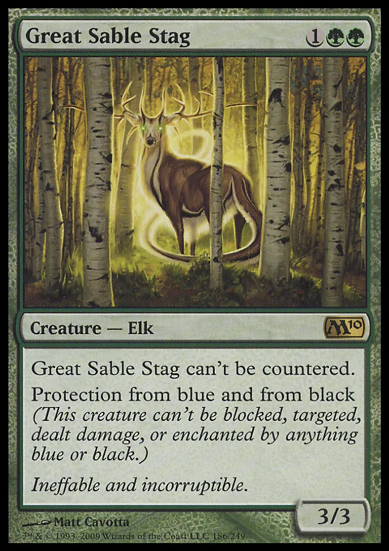 | Oracle Text | Great Sable Stag can't be countered. Protection from blue and from black (This creature can't be blocked, targeted, dealt damage, or enchanted by anything blue or black.) | ||