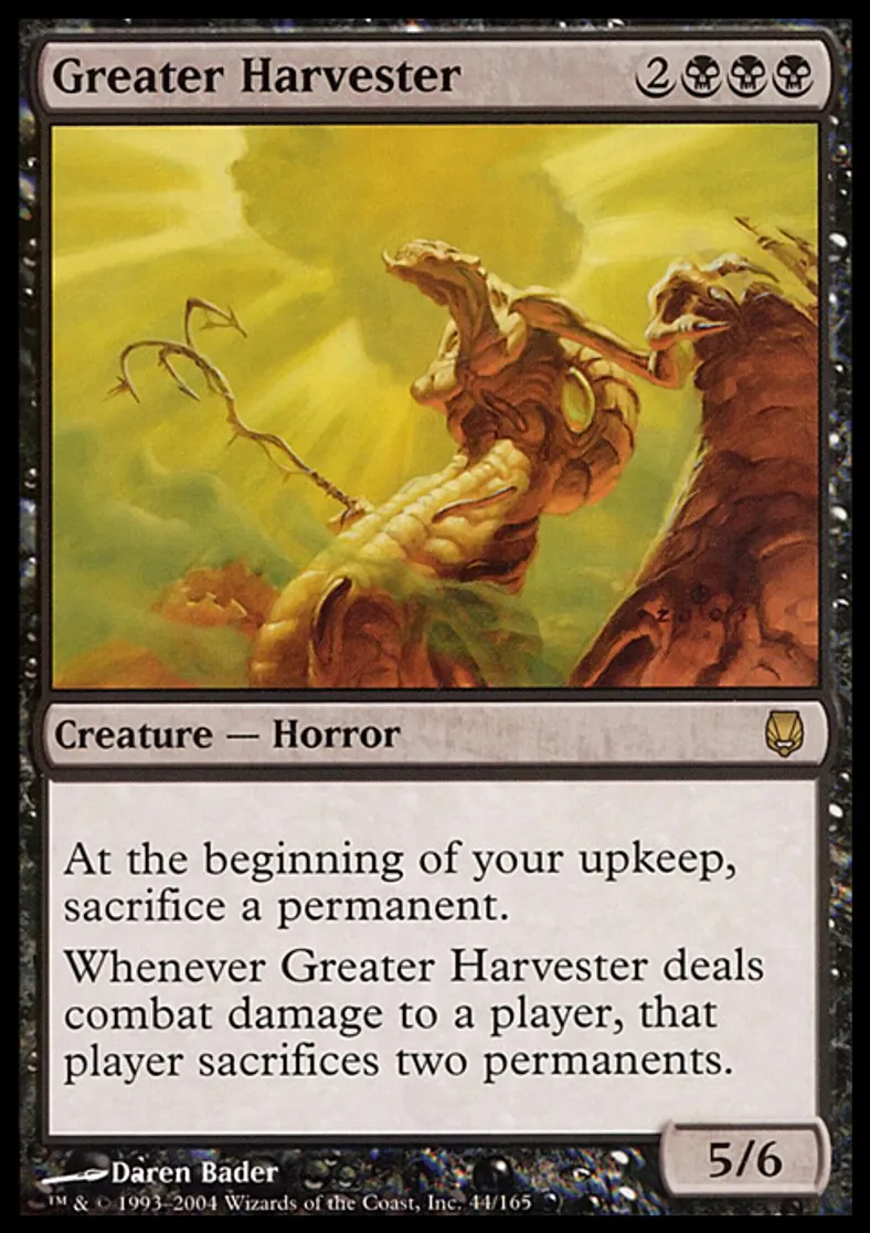 | Oracle Text | At the beginning of your upkeep, sacrifice a permanent. Whenever Greater Harvester deals combat damage to a player, that player sacrifices two permanents. | ||