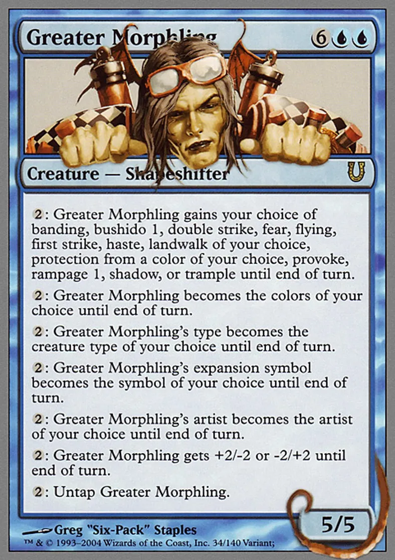 | Oracle Text | {{2}}: Greater Morphling gains your choice of banding, bushido 1, double strike, fear, flying, first strike, haste, landwalk of your choice, protection from a color of your choice, provoke, rampage 1, shadow, or trample until end of turn. {{2}}: Greater Morphling becomes the colors of your choice until end of turn. {{2}}: Greater Morphling's type becomes the creature type of your choice until end of turn. {{2}}: Greater Morphling's expansion symbol becomes the symbol of your choice until end of turn. {{2}}: Greater Morphling's artist becomes the artist of your choice until end of turn. {{2}}: Greater Morphling gets +2/-2 or -2/+2 until end of turn. {{2}}: Untap Greater Morphling. | ||