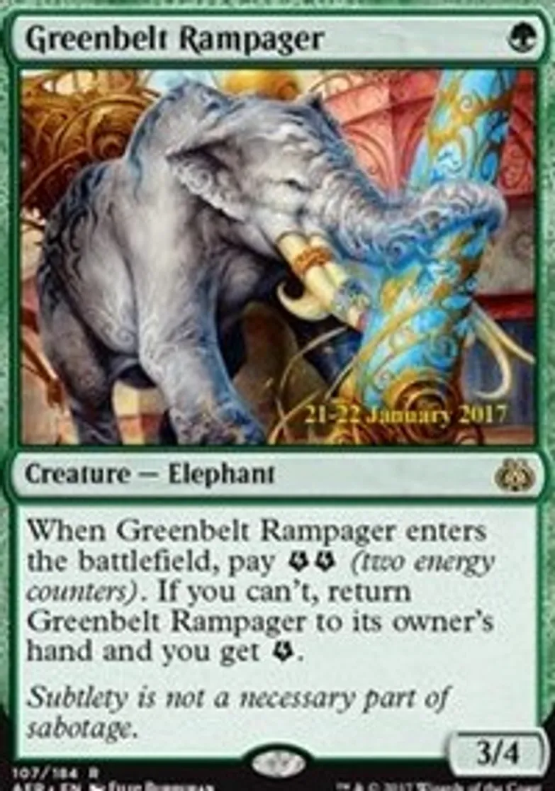 | Oracle Text | When Greenbelt Rampager enters the battlefield, pay {{Energy}}{{Energy}} (two energy counters). If you can't, return Greenbelt Rampager to its owner's hand and you get {{Energy}}. | ||