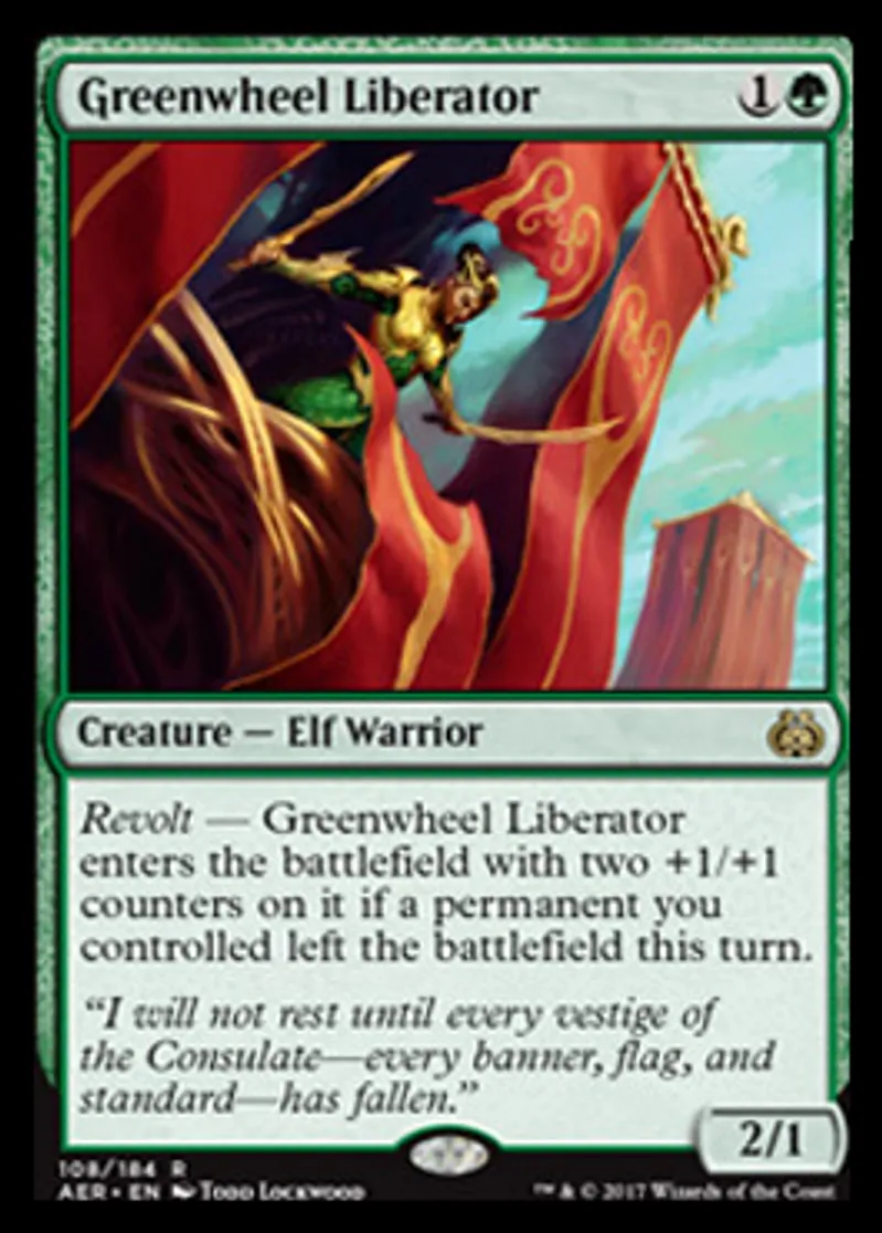 Magic: the Gathering (mtg) Rare Creature - Elf Warrior Greenwheel Liberator from Aether Revolt (AER) last updated 2026-02-21 17:27:36