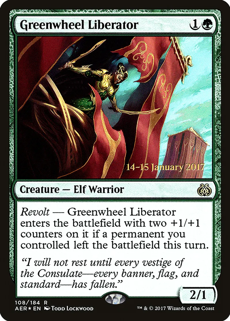 | Oracle Text | Revolt — Greenwheel Liberator enters the battlefield with two +1/+1 counters on it if a permanent you controlled left the battlefield this turn. | ||