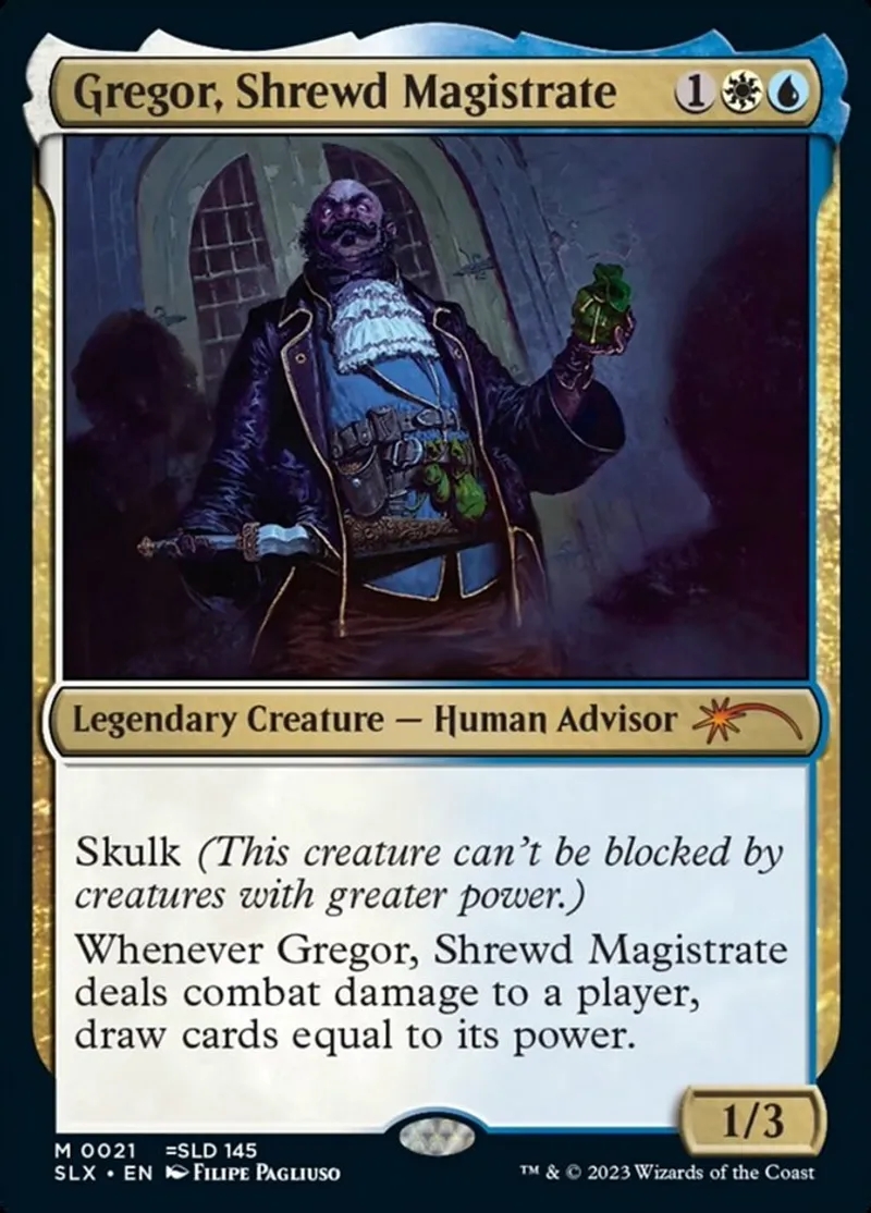 Magic: the Gathering (mtg) Mythic Rare Legendary Creature — Human Advisor Gregor, Shrewd Magistrate from Universes Within (SLX) last updated 2026-02-24 14:28:36