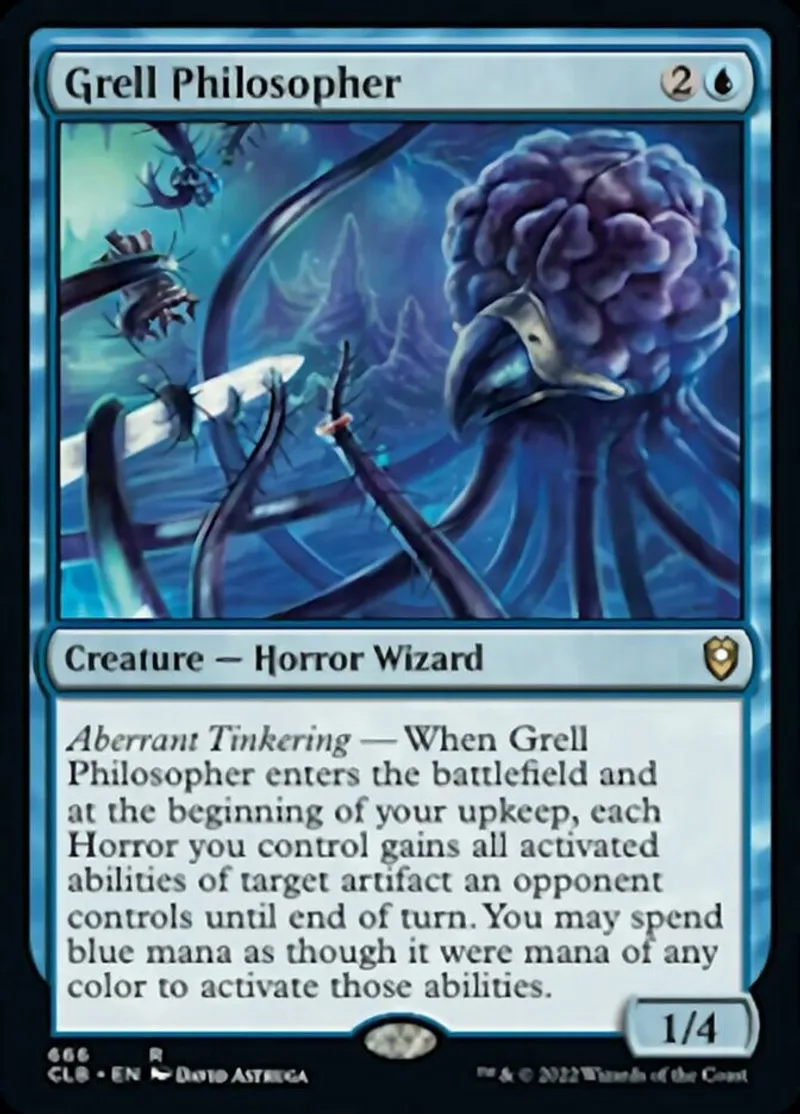 | Oracle Text | Aberrant Tinkering — When Grell Philosopher enters the battlefield and at the beginning of your upkeep, each Horror you control gains all activated abilities of target artifact an opponent controls until end of turn. You may spend blue mana as thought it were mana of any color to activate those abilities. | ||