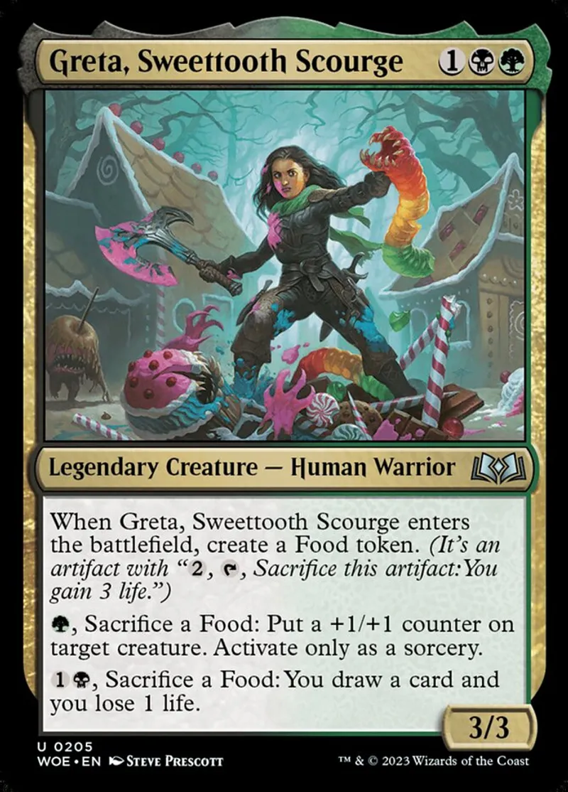 | Oracle Text | When Greta, Sweettooth Scourge enters the battlefield, create a Food token. (It's an artifact with "{2}, {T}, Sacrifice this artifact: You gain 3 life.")