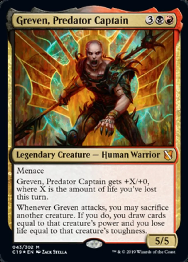 Magic: the Gathering (mtg) Mythic Rare Legendary Creature — Human Warrior Greven, Predator Captain from Commander 2019 (C19) last updated 2026-02-21 16:59:32