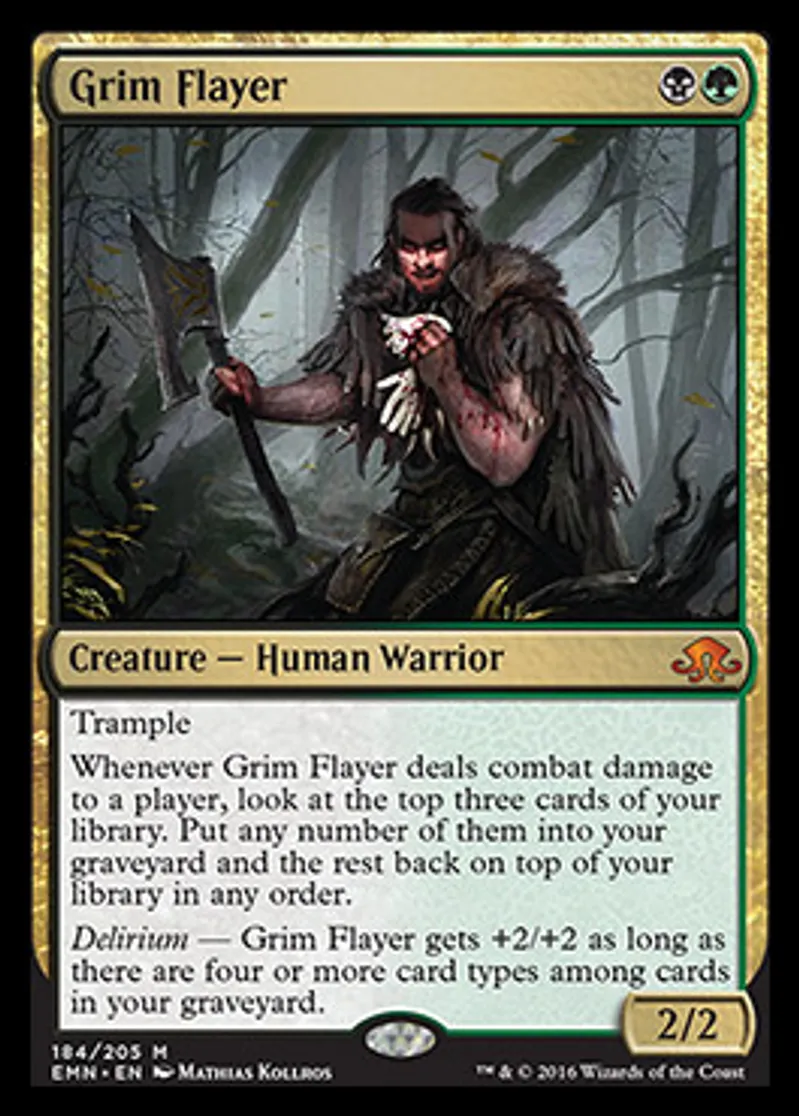 | Oracle Text | Trample Whenever Grim Flayer deals combat damage to a player, look at the top three cards of your library. Put any number of them into your graveyard and the rest back on top of your library in any order. Delirium — Grim Flayer gets +2/+2 as long as there are four or more card types among cards in your graveyard. | ||
