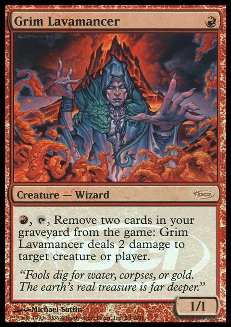 | Oracle Text | {R}, {T}, Exile two cards from your graveyard: Grim Lavamancer deals 2 damage to target creature or player. | ||