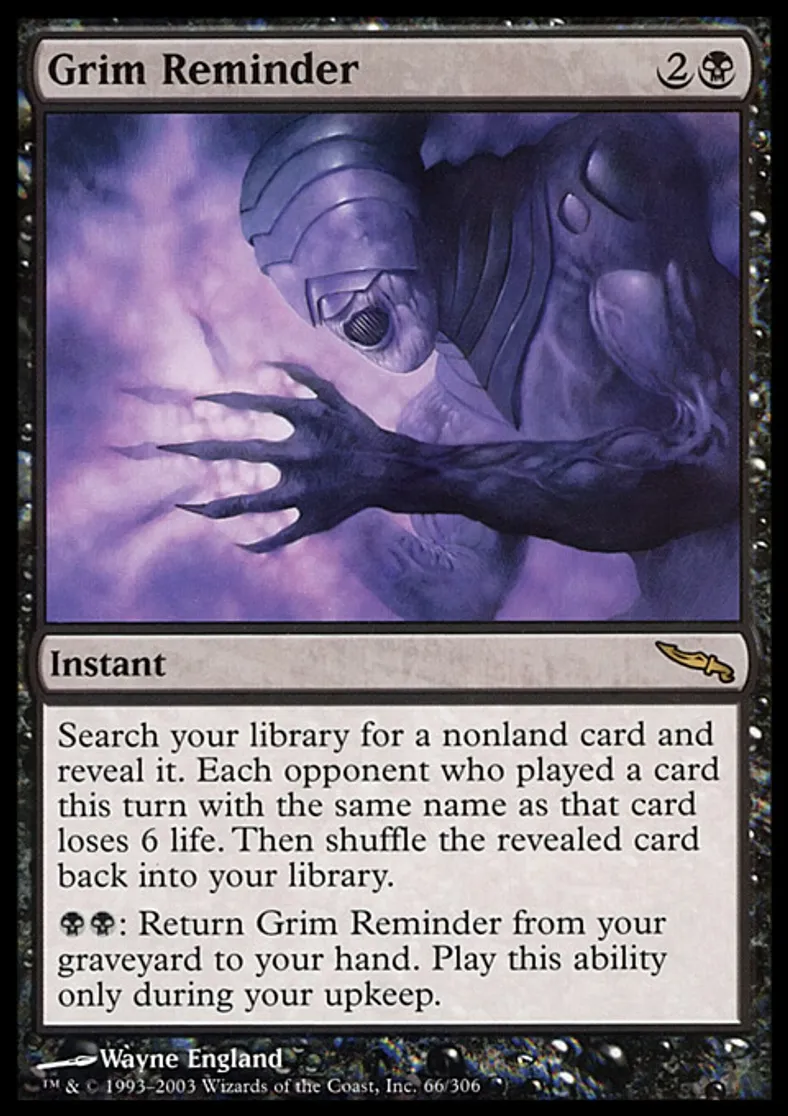 | Oracle Text | Search your library for a nonland card and reveal it. Each opponent who cast a card this turn with the same name as that card loses 6 life. Then shuffle your library. {{b}}{{b}}: Return Grim Reminder from your graveyard to your hand. Activate this ability only during your upkeep. | ||