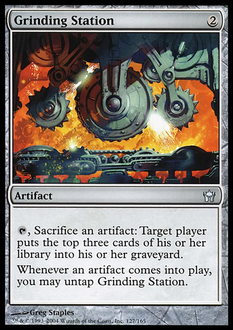 | Oracle Text | {{t}}, Sacrifice an artifact: Target player puts the top three cards of his or her library into his or her graveyard. Whenever an artifact enters the battlefield, you may untap Grinding Station. | ||