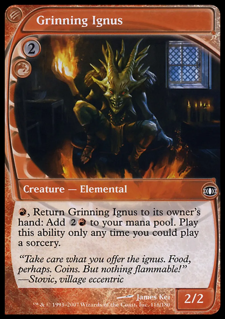 | Oracle Text | {{r}}, Return Grinning Ignus to its owner's hand: Add {{2}}{{r}} to your mana pool. Activate this ability only any time you could cast a sorcery. | ||
