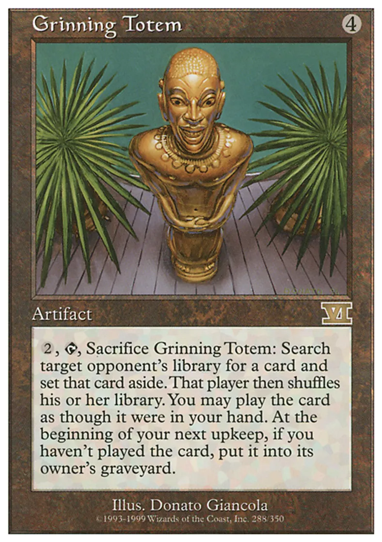 | Oracle Text | {{2}}, {{t}}, Sacrifice Grinning Totem: Search target opponent's library for a card and exile it. Then that player shuffles his or her library. Until the beginning of your next upkeep, you may play that card. At the beginning of your next upkeep, if you haven't played it, put it into its owner's graveyard. | ||