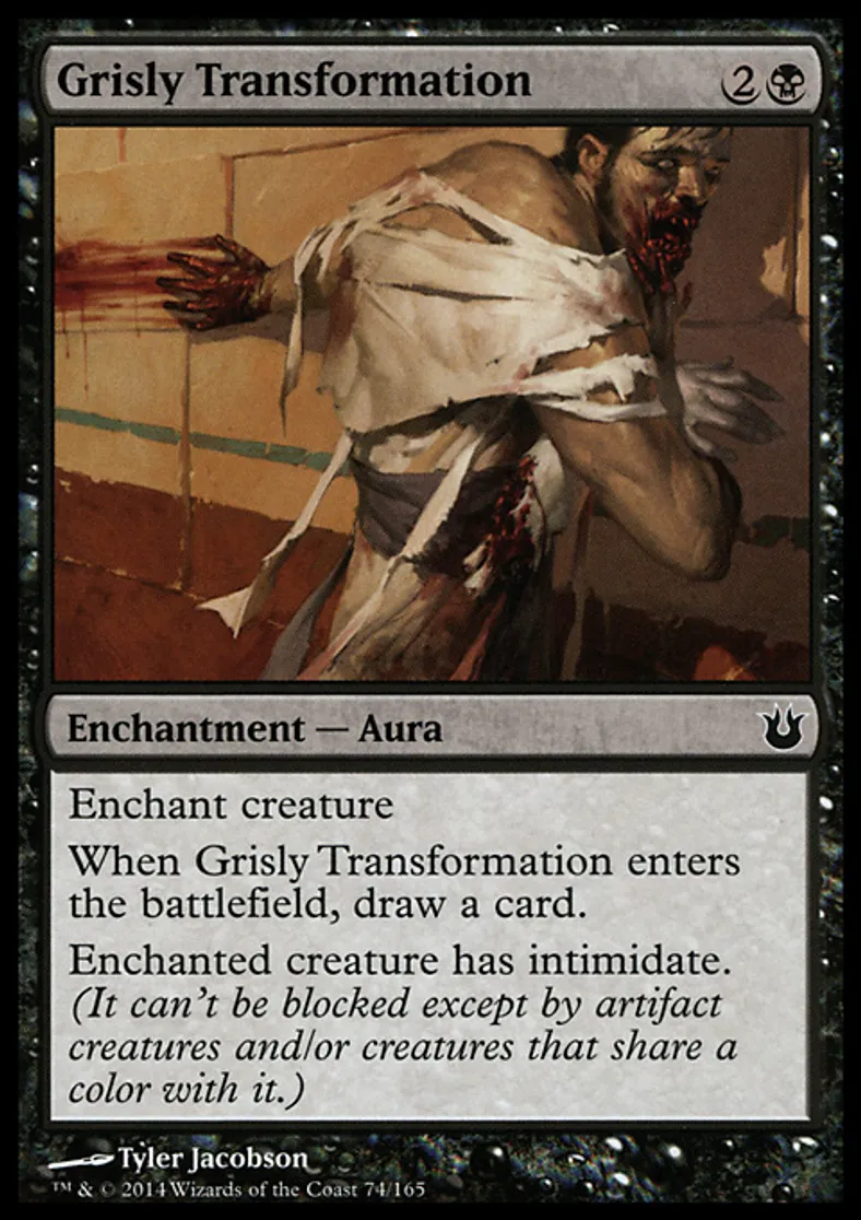 | Oracle Text | Enchant creature When Grisly Transformation enters the battlefield, draw a card. Enchanted creature has intimidate. (It can't be blocked except by artifact creatures and/or creatures that share a color with it.) | ||