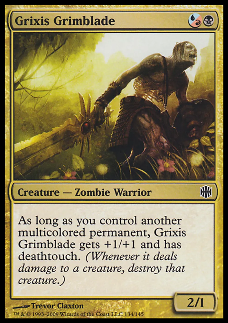 | Oracle Text | As long as you control another multicolored permanent, Grixis Grimblade gets +1/+1 and has deathtouch. (Any amount of damage it deals to a creature is enough to destroy that creature.) | ||
