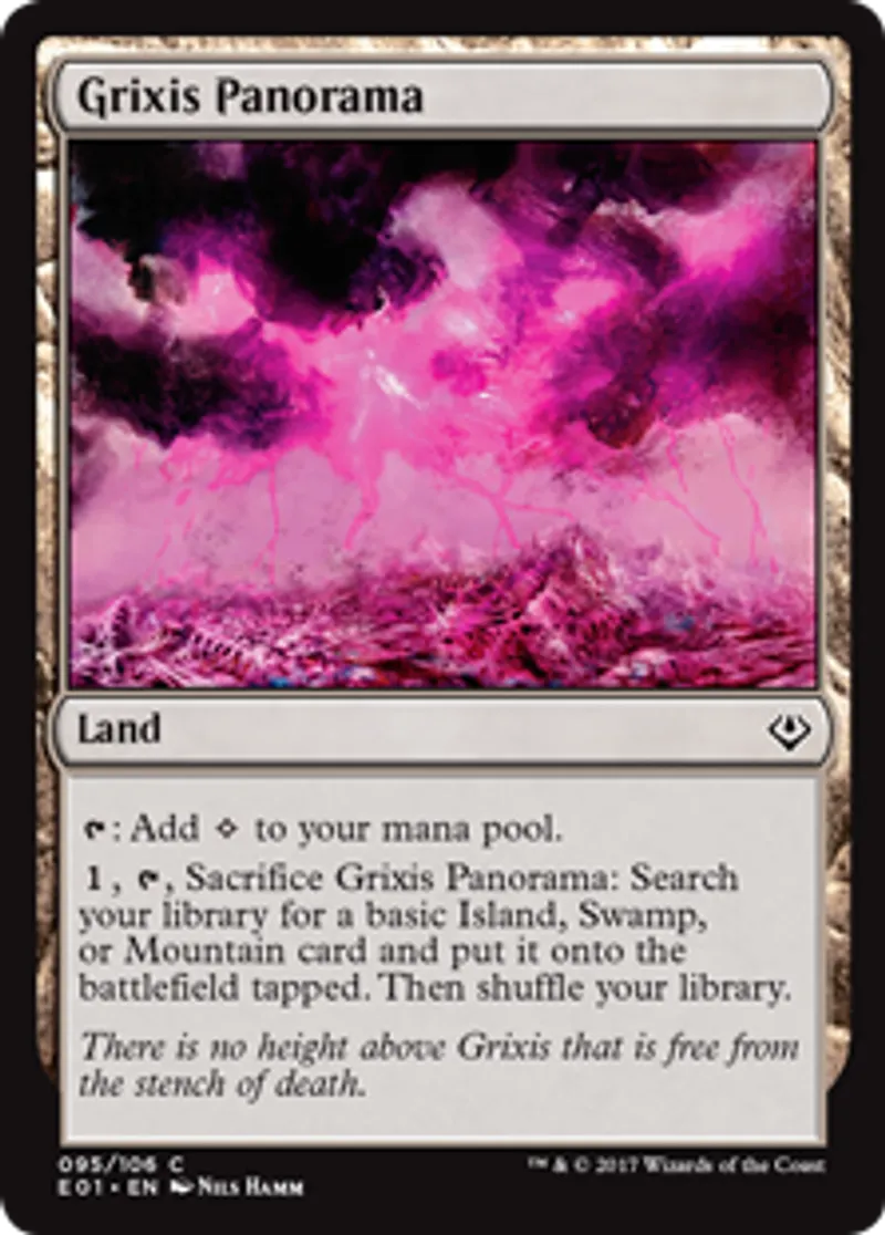 | Oracle Text | {{t}}: Add {{Colorless}} to your mana pool. {{1}}, {{t}}, Sacrifice Grixis Panorama: Search your library for a basic Island, Swamp, or Mountain card and put it onto the battlefield tapped. Then shuffle your library. | ||