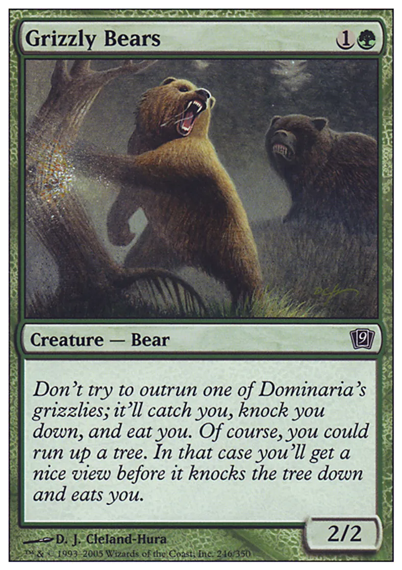 | Flavor Text | Don't try to outrun one of Dominaria's grizzlies; it'll catch you, knock you down, and eat you. Of course, you could run up a tree. In that case you'll get a nice view before it knocks the tree down and eats you. | ||