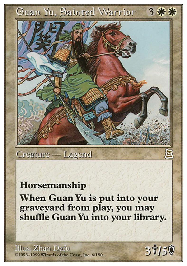 | Oracle Text | Horsemanship (This creature can't be blocked except by creatures with horsemanship.) When Guan Yu, Sainted Warrior is put into your graveyard from the battlefield, you may shuffle Guan Yu into your library. | ||