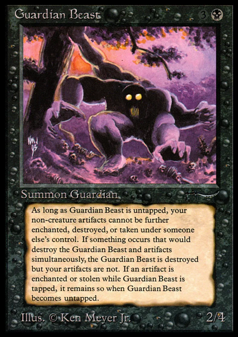 | Oracle Text | As long as Guardian Beast is untapped, noncreature artifacts you control can't be enchanted, they're indestructible, and other players can't gain control of them. This effect doesn't remove Auras already attached to those artifacts. | ||