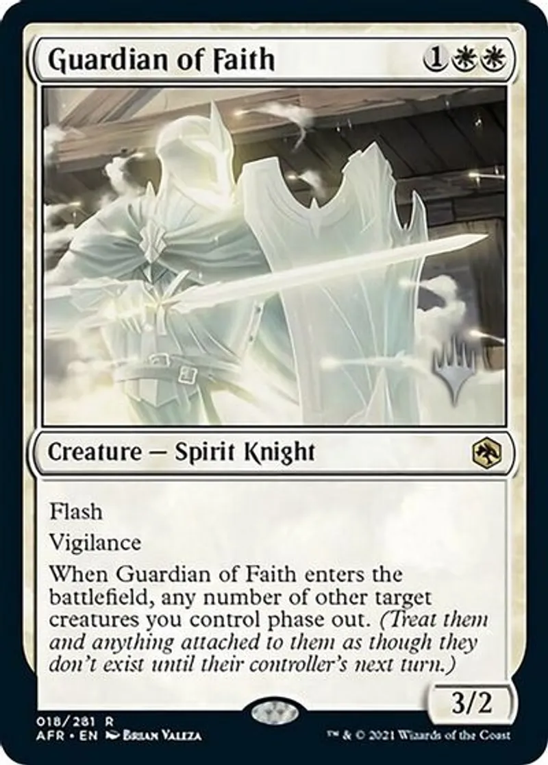 When Guardian of Faith enters the battlefield, any number of other target creatures you control phase out. (Treat them and anything attached to them as though they don't exist until their controller's next turn.) | ||