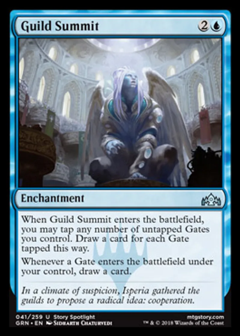 | Oracle Text | When Guild Summit enters the battlefield, you may tap any number of untapped Gates you control. Draw a card for each Gate tapped this way. Whenever a Gate enters the battlefield under your control, draw a card. | ||