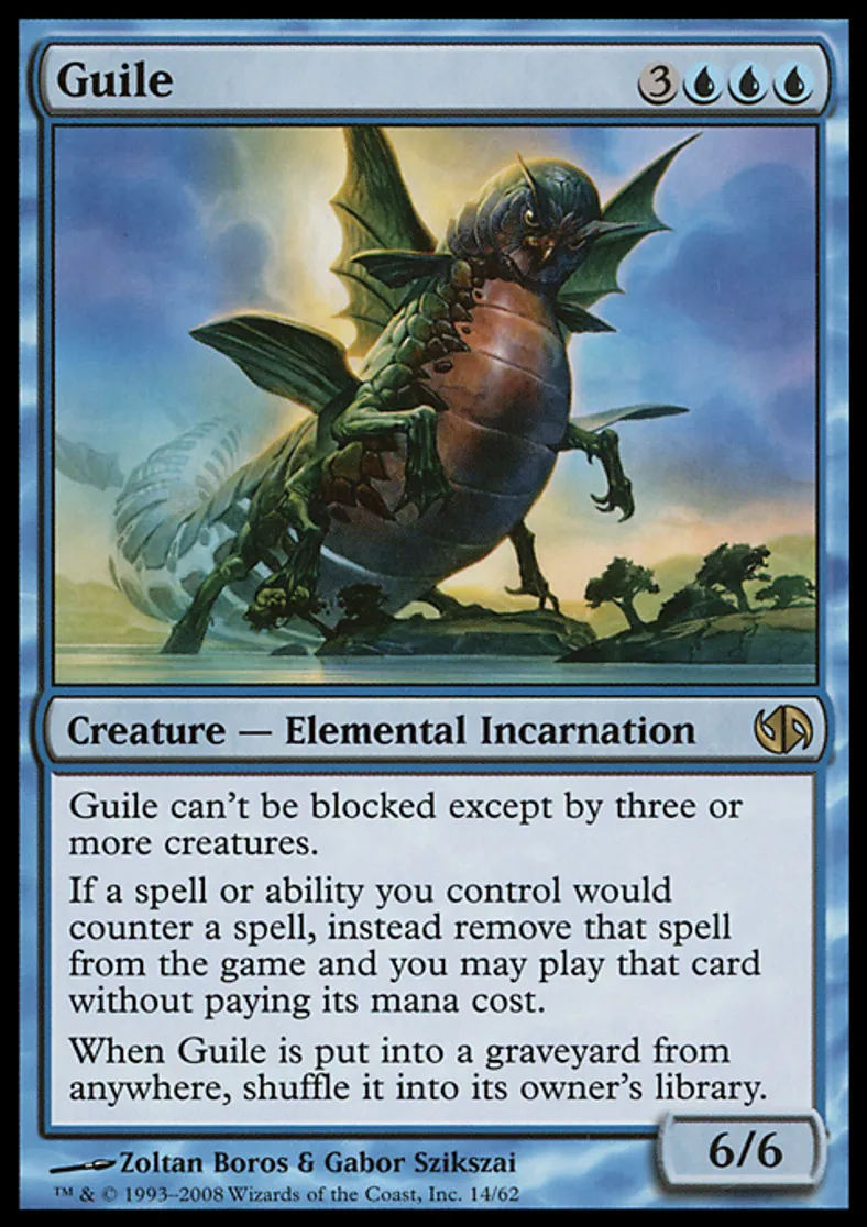 | Oracle Text | Guile can't be blocked except by three or more creatures. If a spell or ability you control would counter a spell, instead exile that spell and you may play that card without paying its mana cost. When Guile is put into a graveyard from anywhere, shuffle it into its owner's library. | ||