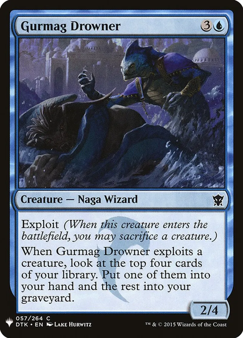 When Gurmag Drowner exploits a creature, look at the top four cards of your library. Put one of them into your hand and the rest into your graveyard. | ||