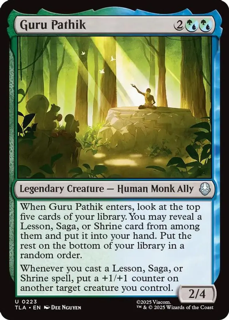 | Oracle Text | when guru pathik enters, look at the top five cards of your library. you may reveal a lesson, saga, or shrine card from among them and put it into your hand. put the rest on the bottom of your library in a random order.